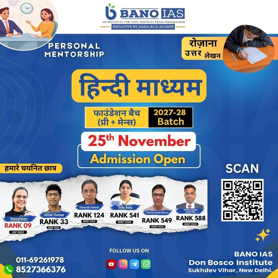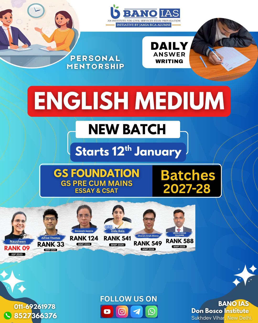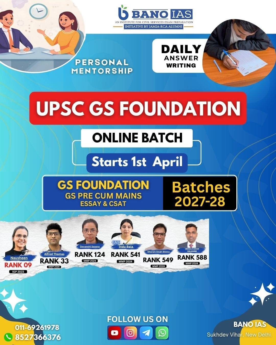The students would be provided mentorship with regards to both: Prelims and Mains. This would be inclusive of: General Studies and CSAT for Prelims, GS-I, GS-II, GS-III, GS-IV and Essay for CS Mains.