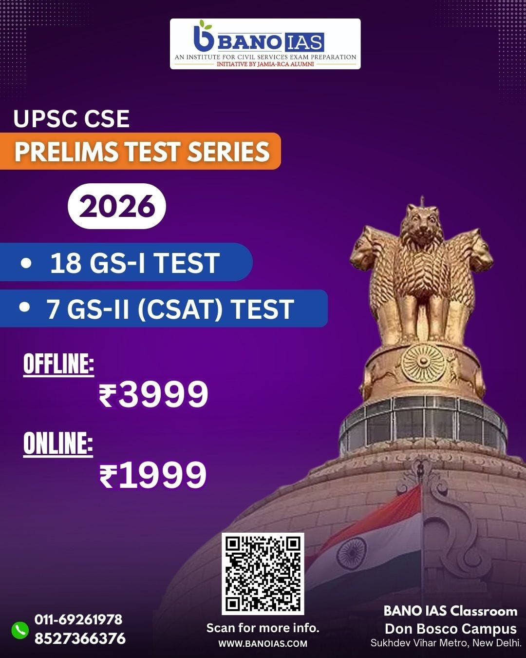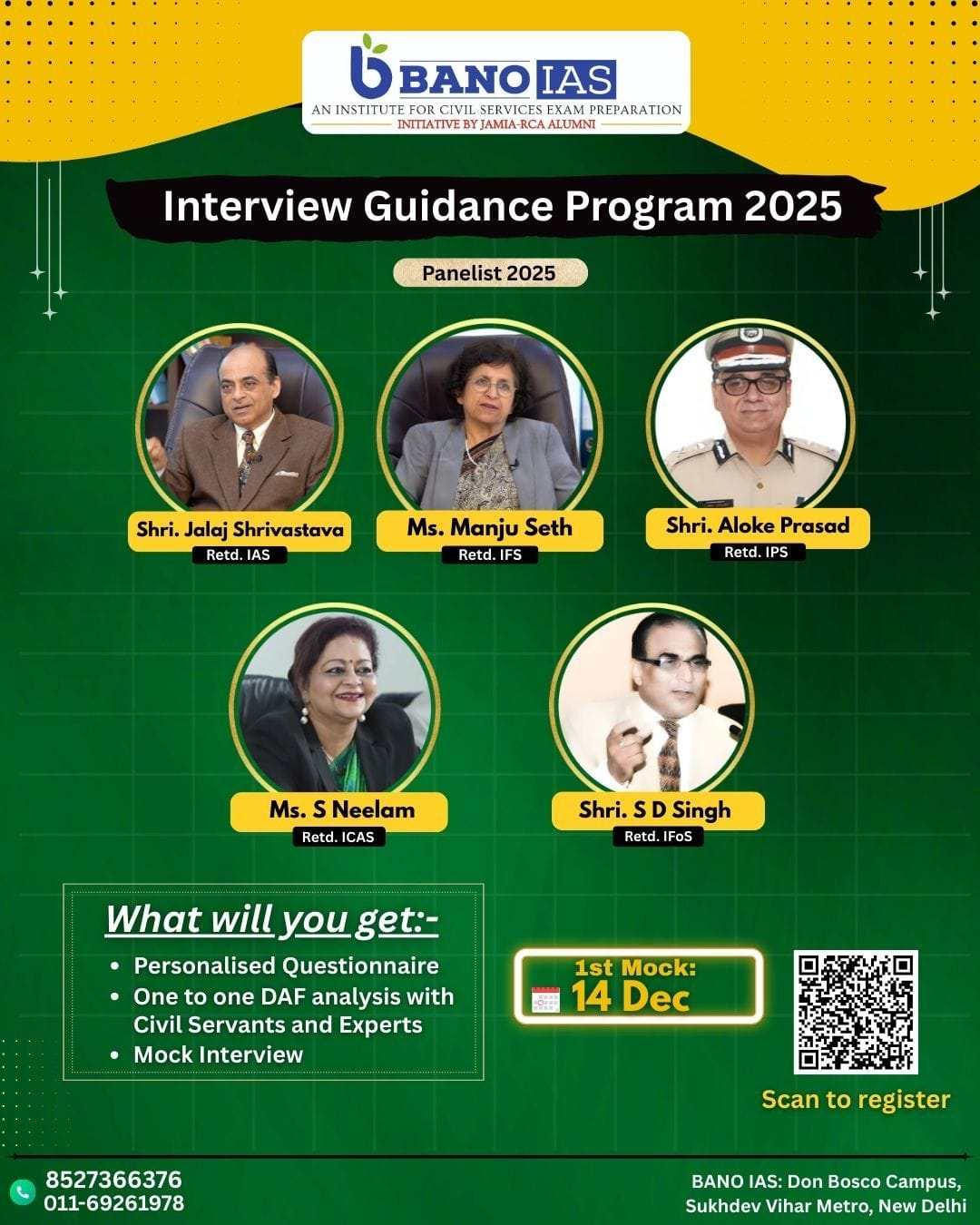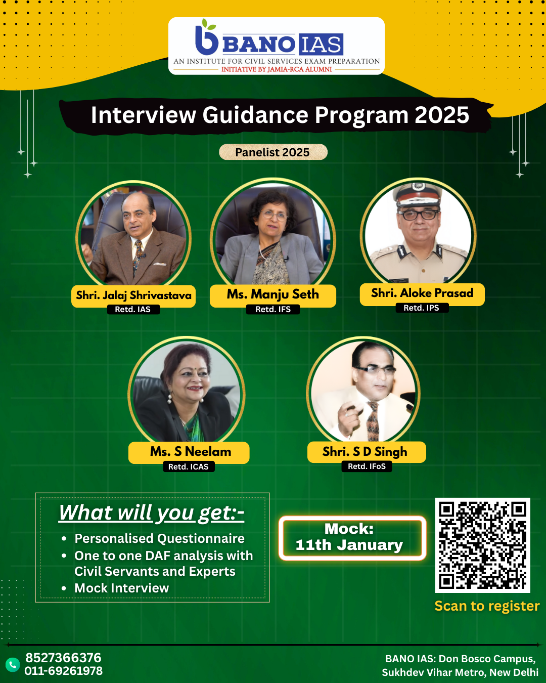 The students would be provided mentorship with regards to both: Prelims and Mains. This would be inclusive of: General Studies and CSAT for Prelims, GS-I, GS-II, GS-III, GS-IV and Essay for CS Mains.